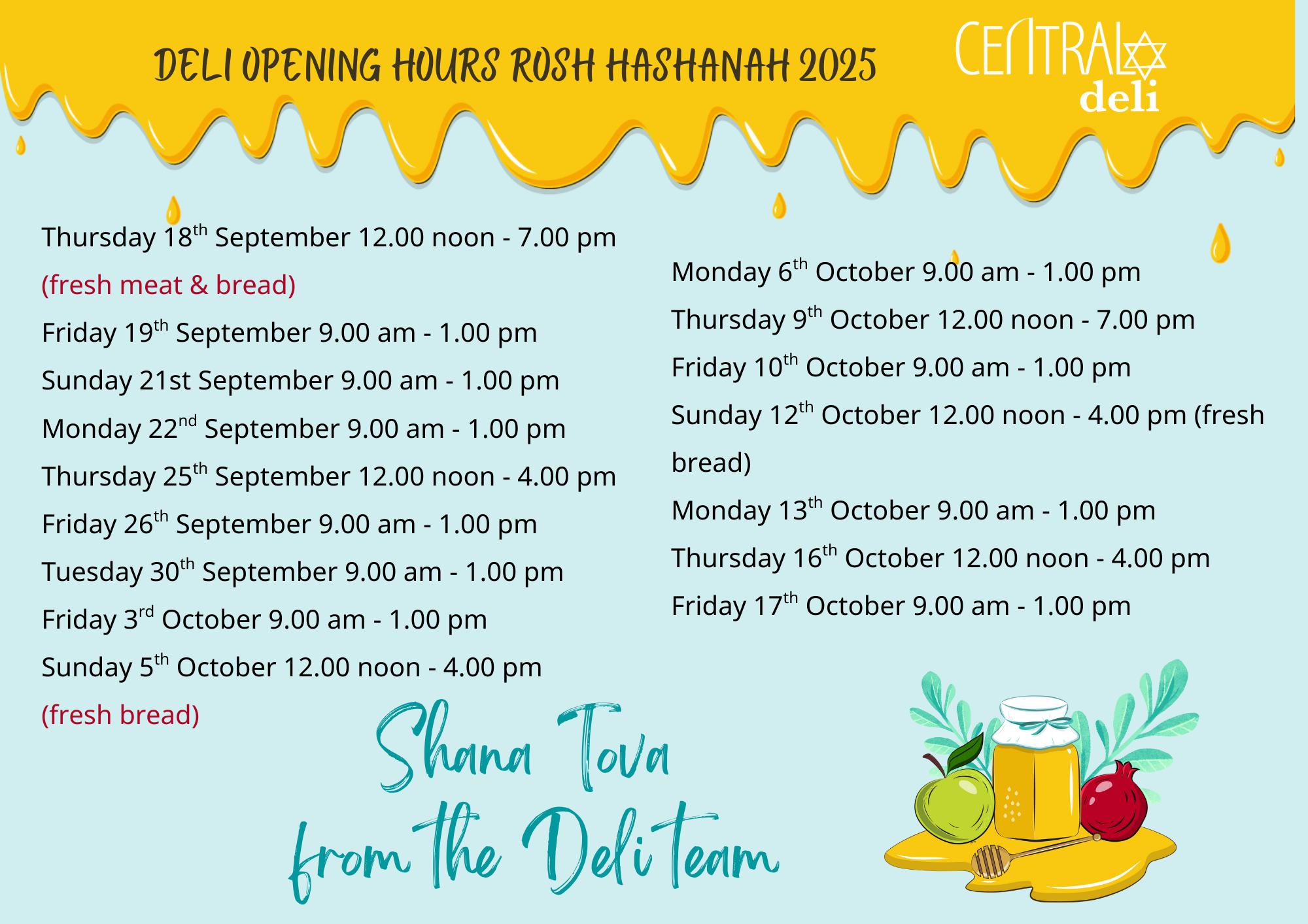 To place an order for collection, email us at deli@centralshul.com. We look forward to serving you!