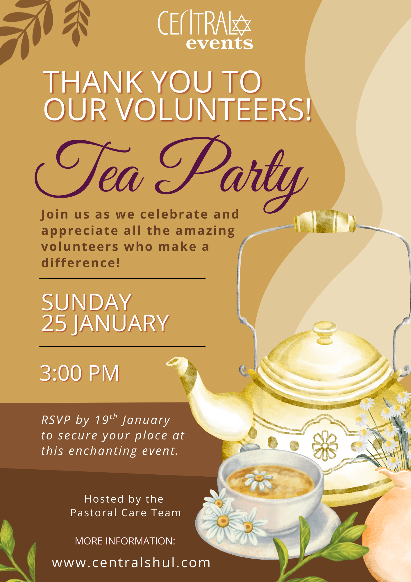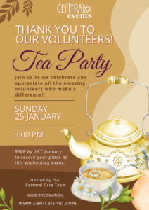 If you volunteer on the kiddush or security rotas, help to make up the minyan or serve on Central’s Executive or Council then this event is for you! All other members and friends welcome too… please join us and show your appreciation for our wonderful volunteers.